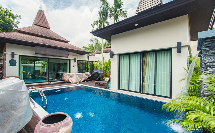 A truly stunning Balinese style pool villa, combining modern design features with traditional Thai architectural features. From the moment you walk through the massive antique Asian doors into the compound, this villa impresses you: from tropical gardens and covered terraces outside to the beautiful hardwood dining table, many canopy beds and comfortable, elegant furniture throughout the interior. All of the living space and all three of the bedrooms open onto the pool area, giving an open, airy, relaxing feel to the villa. It's natural charm and modern design are perfect for your next holiday escape. It is located on the north-western coast of the island, very close to Surin and Layan beaches. While nestled in a quiet, secluded area bordered by a rubber-tree plantation, the neighborhood includes several luxury villa estates. A short drive in any direction will bring you to the restaurants and shopping areas of nearby Surin, Bangtao, Laguna and Layan.